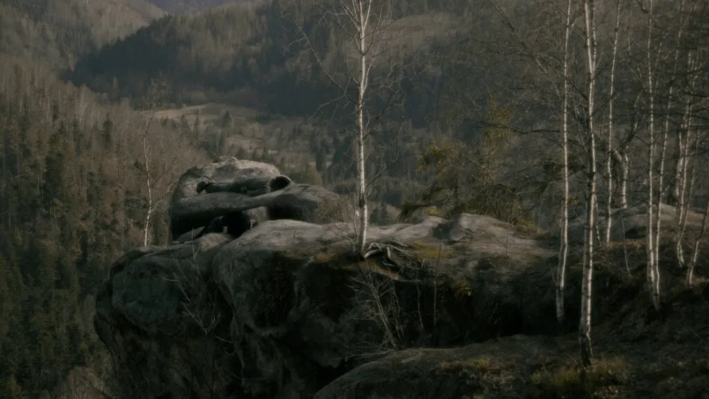 La primera instalación, The Wanderer (2022), producida poco después del inicio de la invasión y perteneciente a la Colección TBA21, parte de una operación visual que dialoga con la tradición romántica europea. Los artistas escenifican con sus propios cuerpos las posturas de soldados rusos muertos que se confunden con el paisaje de los Cárpatos, evocando de forma crítica la figura del caminante de Caspar David Friedrich. La referencia no es ornamental: al confrontar la estética del paisaje sublime con la realidad de los cadáveres, la obra cuestiona la herencia cultural desde la que Europa ha construido determinadas imágenes de la muerte y del territorio. Al mismo tiempo, establece un vínculo con la tradición de intervención crítica del arte ucraniano contemporáneo, especialmente con acciones satíricas desarrolladas en los años noventa